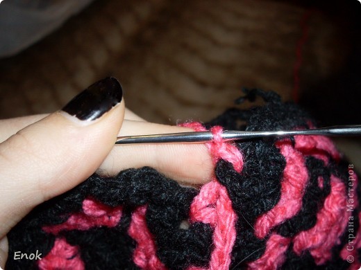 3.Второй ряд другим цветом.По углям провязываем два раза по 2 столбика, для закругления.
